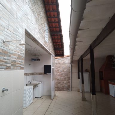 Dois corredores laterais sendo um saída para garagem e o outro corredor com um armário para ferramentas e depósito material de praia